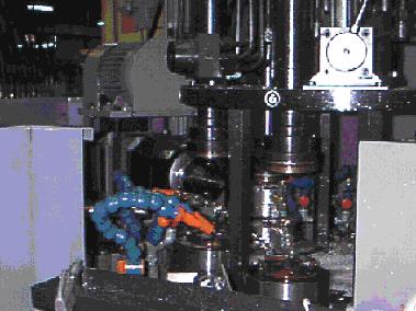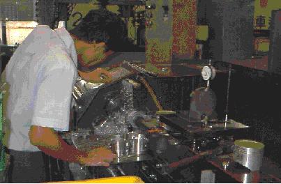 Above: A computer controlled machine (CNC) is used to cut the piston ring grooves. All three piston ring grooves are precision cut in one operation.Below: This is a CNC Precision boring, honing, sizing, and piston clip machine. All 4 operations are done sequentially on five pistons at a time without removing the piston This increases quality control while decreasing unit cost.